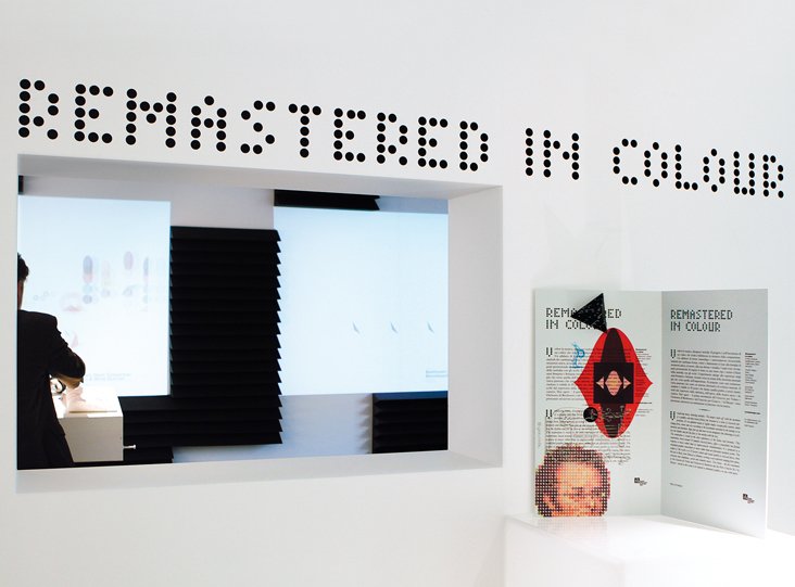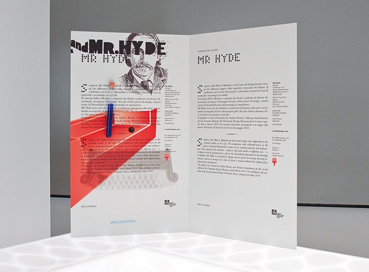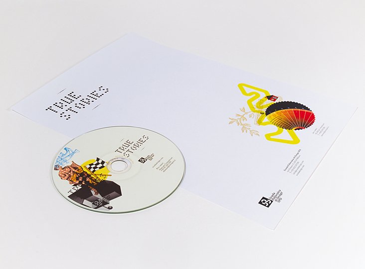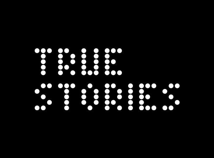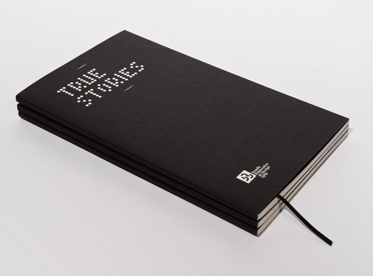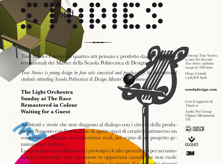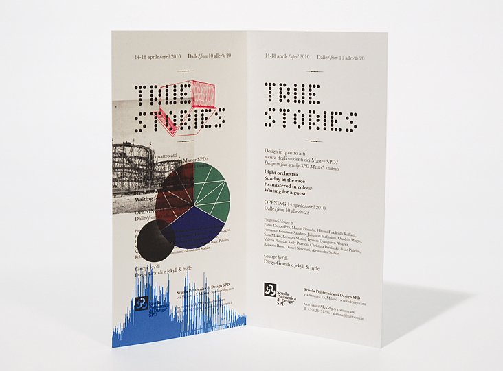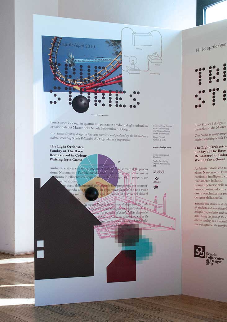 visual identity for the exhibition true stories – design in quattro atti: logo, font, invitation card, installation, signage, catalogue